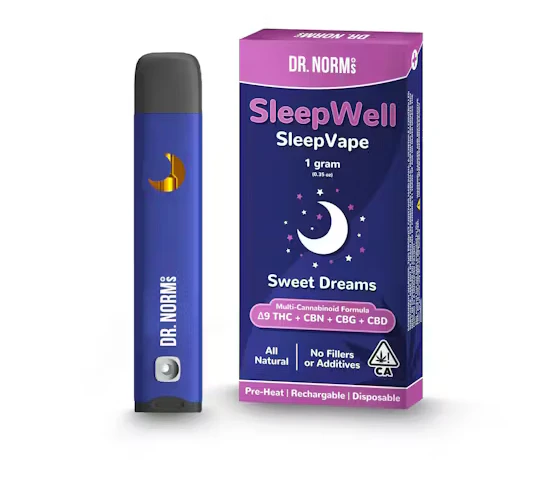 The second SKU in Dr. Norm’s SleepWell sub brand is our disposable, rechargeable Sleep Vape. It has a Full Gram of cannabinoids including THC, CBN, CBG and CBD - the 4 most effective cannabinoids for sleep. It contains approximately 55% THC, 20% CBN, 10% CBG and 10% CBD. It is 90% cannabinoids and 10% terpenes - NO filler. This is the ONLY sleep vape in CA that contains all 4 of these cannabinoids. The formulation is science based in ideal ratios to create optimal effect. This vape has 3 heat settings so that the user can determine how much THC they want to draw each time. This is a first for a disposable/rechargeable device to have temperature control settings. The vape comes with a charging cable for the USB-C charging port.