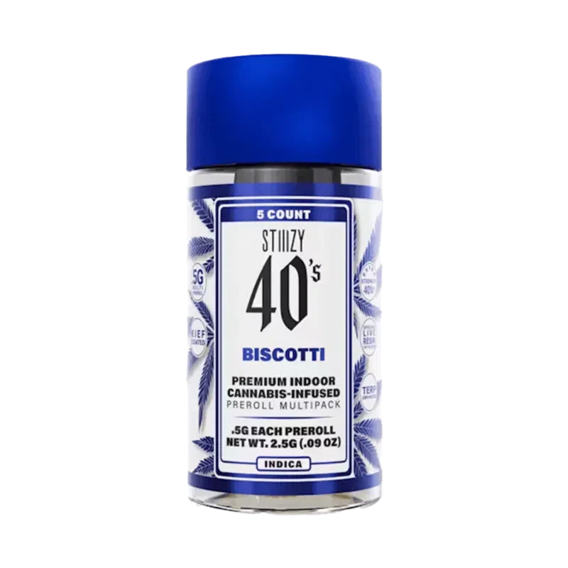 Elevate your pre-roll game. Stiiizy 40s pre-rolls are setting the standard with high potency, cannabis infused joints coated evenly with kief. Using our proprietary live resin infusion methods, we’ve designed every pre-roll to offer 40%+ THC potency with a unique flavor profile. With a smooth inhale and tasteful exhale, each and every Stiiizy 40 is packed with indoor grown flower, specifically made to ensure a potent and long-lasting high. Spark up the 40s. An Indica-dominant strain that comes from Gelato #25 and South Florida OG. Biscotti delivers a powerful body high and delicious flavor.