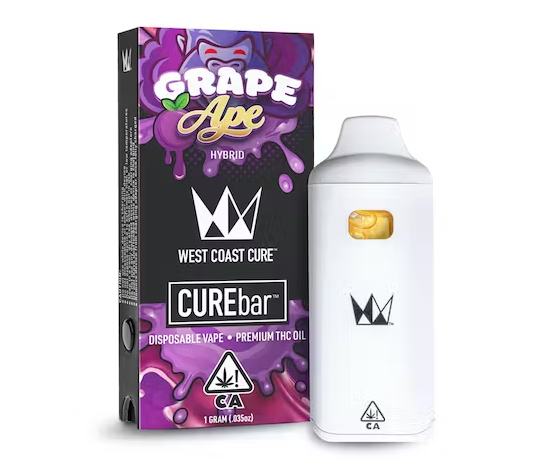 WCC's Grape Ape Disposable CUREbar contains a Hybrid oil that inspires a tranquil outlook for the rushed consumer. This ready-to-rip disposable vape has a fruity full-gram tank of premium THC oil. Derived from a Grape Ape phenotype, it provides a soothing vape with a refreshing pull.
