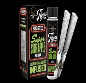 Claybourne is stoked to introduce our newest addition to our product line - Frosted Flyers! These half-gram, infused pre-rolls are terpene-enhanced and made from the finest indoor full-nug flower in California! What could be better These flavorful pre-rolls are infused with premium liquid diamonds for a powerful experience that will deliver the maximum lift youve been craving. _____ Take a bite of the forbidden fruit! Super Sour Apple is a mouth watering sativa thatll have you puckering up. Dont be afraid to suck down this bad boy as its more sweet than it is sour with a tasty, tart apple profile and undertones of citrus and diesel. Its long lasting and powerful effects hit the mind with creative juices, sure to keep you uplifted and alert.