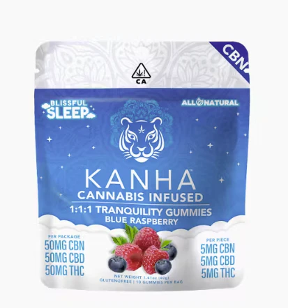 Kanha 1:1:1 Tranquility CBD Gummies 50mg CBD x 50mg THC x 50mg CBN per bag Kanha gummies are made with all-natural ingredients, coloring, and flavoring. Each gummy is infused with the highest quality cannabis oils to provide the most consistent, safe experience on the market. Our Blue Raspberry Tranquility gummies are the satisfyingly sweet calm you've been seeking. These 1:1:1 gummies are formulated to give you a restful night's sleep, with more sleep-inducing CBN than any other edible, 1mg of melatonin per gummy, and a blend of terpenes and essential oils that provide a relaxing and soothing effect.