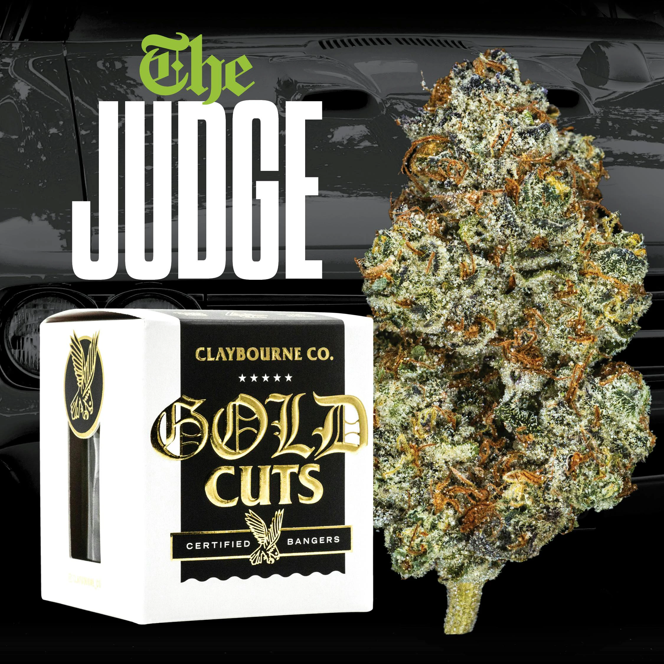 Exclusive and unique genetics from Claybourne’s breeding and selection program. Gold Cuts are hand-trimmed on the stem, using minimal touch processing for maximum trichome preservation. We call this strain “The Judge” because it frickin’ rules. The Judge is an indica with a distinct diesel aroma juxtaposed by its coffee and plum flavor. The pungent smell, coming from its Chem Dawg lineage, is offset by the fact it’s our highest testing strain ever, proving that The Judge is indeed stern, but more than fair. Lineage: Kush, Chem Dawg, Sour Diesel. Profile: Diesel, Funk, Pungent.