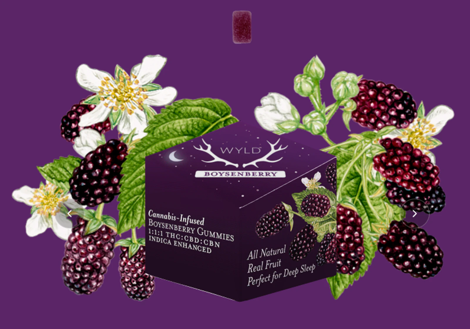 Hit the snooze button. Boysenberry THC:CBD:CBN gummies are perfect for deep sleep. CBD helps the body relax, while CBN can provide a restorative rest for the mind. When combined with THC, Wyld's Boysenberry gummy activates the Entourage Effect to set the landscape for a relaxing, restorative sleep. 100mg THC:100mg CBD:100mg CBN per package, 10mg THC:10mg CBD:10mg CBN per gummy. Perfect for deep sleep | Made with Linalool, Myrcene, Beta-Caryophyllene + Terpineol.