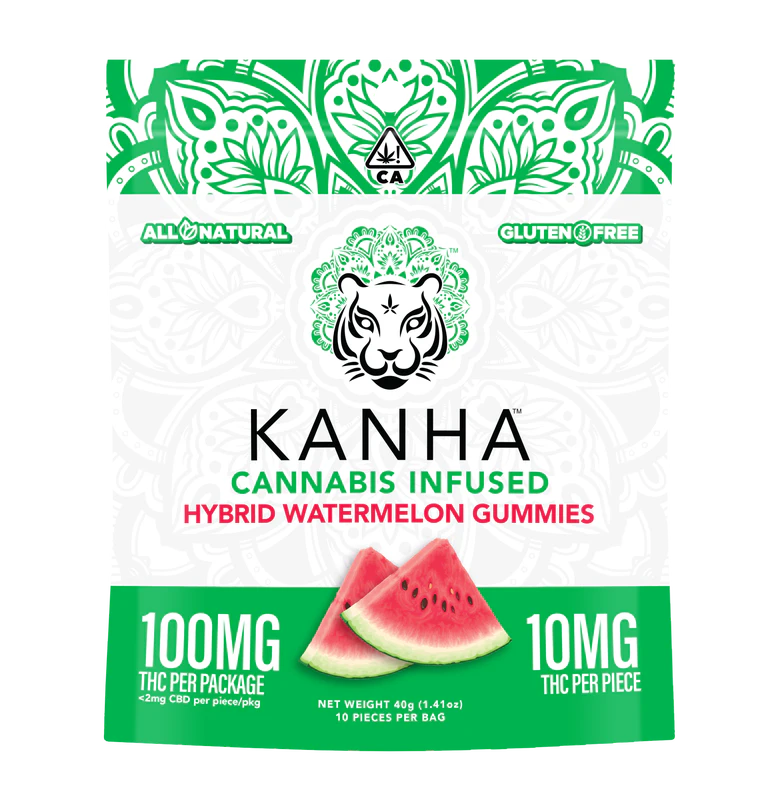 Kanha gummies are made with all-natural ingredients, coloring, and flavoring. Each gummy is infused with the highest quality cannabis oils to provide the most consistent, safe experience on the market. Our Watermelon gummies are refreshingly juicy and made with hybrid terpenes, which will put you somewhere in the middle of uplifted and relaxed. 10 pieces x 10mg/gummy = 100mg/bag