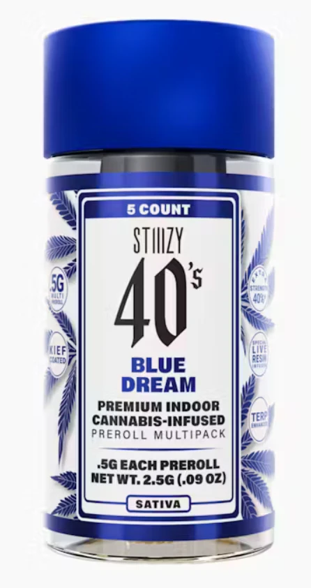 Stiiizy is setting the standard in the pre-roll game with the most revolutionary and innovative products. �� Elevate your pre-roll game. Stiiizy 40s pre-rolls are setting the standard with high potency, cannabis infused joints coated evenly with kief. Using our proprietary live resin infusion methods, we've designed every pre-roll to offer 40%+ THC potency with a unique flavor profile. With a smooth inhale and tasteful exhale, each and every Stiiizy 40 is packed with indoor grown flower, specifically made to ensure a potent and long-lasting high. Spark up the 40s. �� BLUE DREAM / SATIVA �� Taste: Blueberry �� Description: The Blue Dream 40s confidently gives you a burst of blueberry flavor with a high potency to ensure a smooth inhale followed by a tasteful exhale. �� Feeling: Relaxed, Happy, Uplifted Infused Pre RollBerryBlue DreamBlueberryEarthyHappyRelaxedSativaTHCUplifted About this strain: Blue Dream Blue Dream is a popular strain with various sources of origin. Below are several anecdotes about the strain's inception. �� Origin 1: Blue Dream by Unknown The clone-only version of Blue Dream is a sativa-dominant hybrid that was first cultivated in Northern California. A cross of DJ Short's Blueberry F5 strain and Santa Cruz Haze, Blue Dream produces several noteworthy phenotypes and is known to produce varied phenotypes with heavy yields. �� Origin 2: Blue Dream by Mystic Seeds Blue Dream by Mystic Seeds is an indica-dominant cross of DJ Short's Blueberry strain crossed with a powerful OG Kush from Los Angeles. �� Origin 3: Blue Dream by DJ Short A new Blue Dream by DJ Short was reportedly recently created and branded as Azure Haze, after crossing a Silver Haze mother and a Blueberry F4 father. �� Origin 4: Blue Dream by Humboldt Seed Organization Blue Dream by Humboldt Seed Organization is a sativa-dominant strain derived from feminized seeds. Created from a cross of Blueberry and Super Silver Haze (SSH), this version of Blue Dream is suitable for cultivating indoors or in a greenhouse. ��