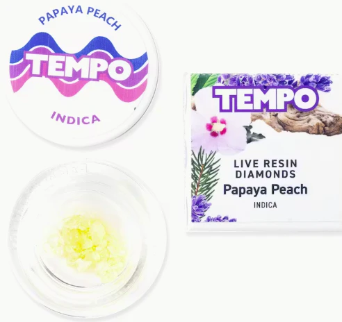 Tempo’s Papaya Peach Live Resin Diamonds deliver a smooth, tropical unwind with notes of ripe papaya, juicy peach and hints of mango. Dominant in Myrcene and Linalool, this relaxing indica concentrate melts away tension and invites deep calm, making it perfect for evening sessions or winding down after a long day. Crafted through a slow-cure process that forms pure THCA diamonds suspended in rich, terpene-heavy sauce, this extract captures the strain’s natural fruit-forward flavor and tranquil body effects.