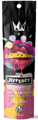 The Dabilicious Jefferey 1.2g single infused joint is where nostalgia meets potency! A hit from the past with its old-school flavor, each joint is infused with whole nug flower, live resin diamonds, and high-end kief, creating a deliciously strong experience. Offering the perfect blend of retro vibes with modern strength – it's an infused trip down memory lane with a twist of clarity.