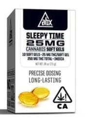 25mg/THC per capsule. ABX Sleepy Time is formulated with potent THC and a supporting blend of terpenes in an easy-to-consume, precisely-dosed gel capsule, designed to promote restful slumber. Premium distillate cannabis oil and high-quality coconut oil (MCT) aid absorption of the cannabis oil for optimal benefits.