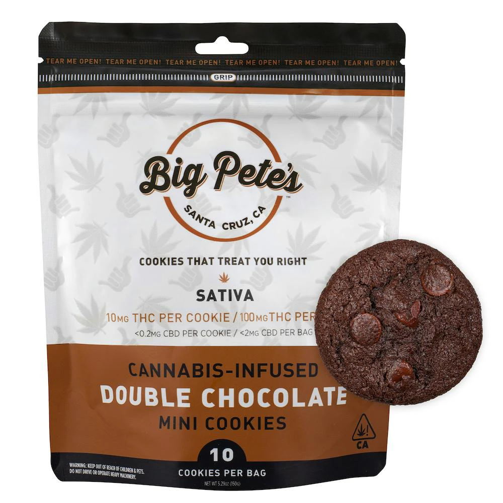 DOUBLE CHOCOLATE Available in 10-packs or individually packaged. Each cookie contains 10 milligrams of THC from either Indica or Sativa cannabis varieties. PAIR WITH Fresh Strawberries Bonfires on the Beach Jam Sessions INGREDIENTS Sugar, chocolate sandwich cookies (unbleached enriched flour, sugar, palm oil, cocoa, high fructose corn syrup, leavening {baking soda, calcium phosphate}, cornstarch, salt, soy lecithin, vanillin, chocolate), chocolate chips (sugar, unsweetened chocolate, cocoa, butter, dextrose, sunflower lecithin), butter (pasteurized cream {milk}), enriched bleached wheat flour (wheat flour, malted barley flour, niacin, reduced iron, thiamine, mononitrate, riboflavin, folic acid), eggs, cocoa powder, chocolate syrup (high fructose corn syrup, corn syrup, water, cocoa, sugar, salt, mono and diglycerides, xanthan gum, polysorbate 60, vanillin, artificial flavor), vanilla extract (vanilla bean extratives in water, alcohol), leavening (sodium bicarbonate).