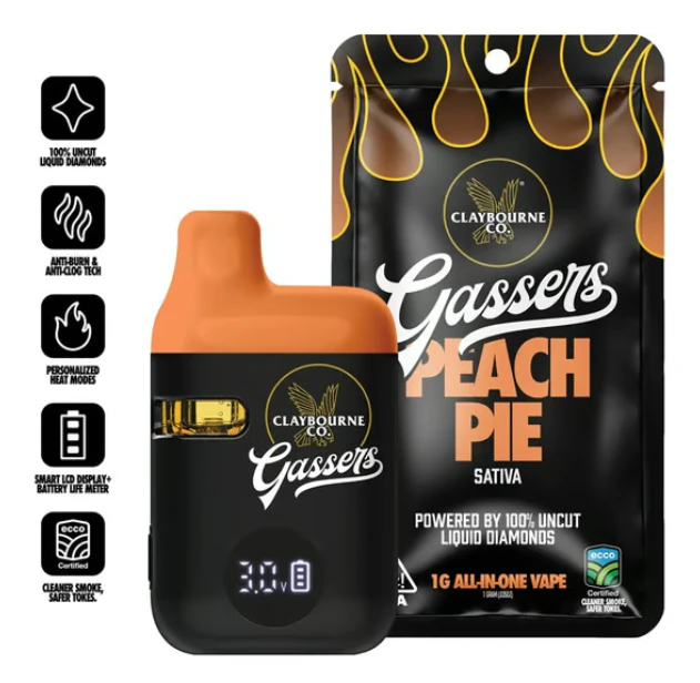 Meet the cleanest and the meanest, Gassers All-In-One Vape. Powered by 100%, uncut liquid diamonds delivering next-level potency & flavor in a personalized, pocket-ready device. Built tough, tuned for performance, and certified clean so you can stay always on the gas. Available now in (15) 1g strains from classic gas to fruity bangers. Pure Liquid Diamonds + Natural Terpenes: Nothing Cut, Nothing Diluted with an Average of 90-92% Total THC. Palm-Style, USB-C Rechargeable: Ready-to-Go on the Low. Anywhere at Anytime. Adjustable Temperature Control: Dial-In Max Flavor or Cloud Intensity. Smart LCD Display: Easier to Use Settings for Total Control. Anti-Burn & Anti-Clog Tech: Smooth Drags from First to Last. High-Performance Build: Oil-Resistant & Heat-Proof to Avoid Microplastic Breakdown. ECCO Certified Clean Oil: Tested for over (60) Extra Pesticides Beyond California State Requirements.