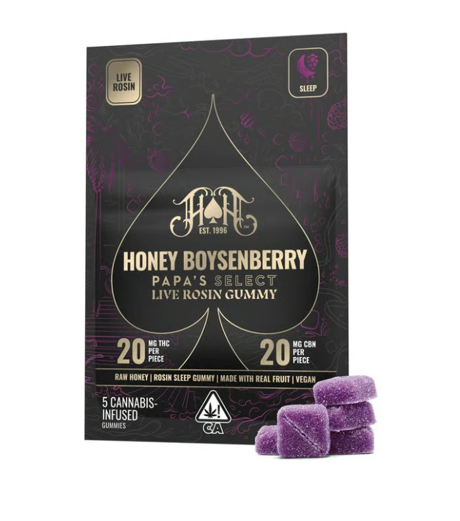 Unwind with the rich, soothing flavor of honey and boysenberry, infused with first-press Live Rosin from award winning Papa Select hash. This full-spectrum gummy blends CBN and THC for a naturally potent, deeply relaxing sleep experience.