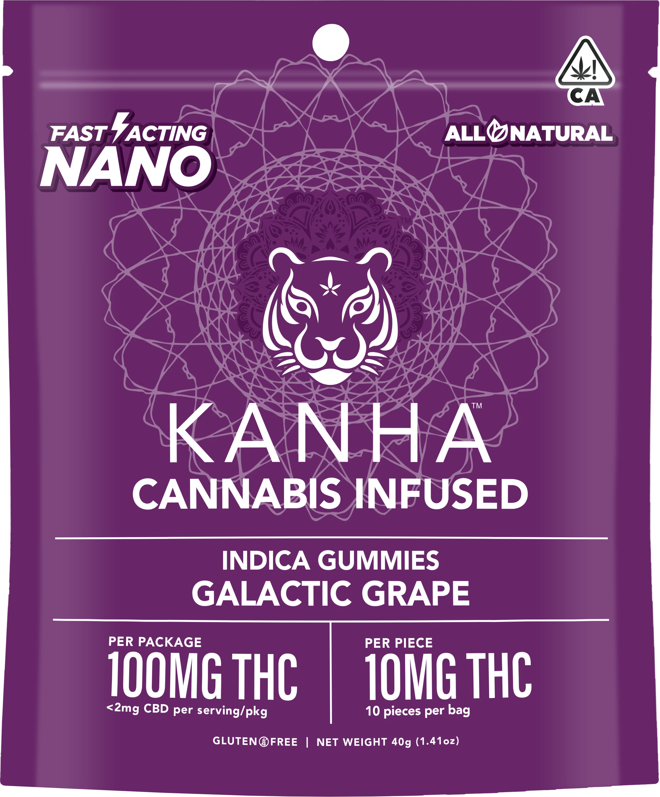 Who needs wine when Galactic Grape Indica gummies deliver the flavor of harvest-ready grapes with reserve-worthy indica oil and terpenes like myrcene, α-humulene and β-caryophyllene. Each soft and juicy gummy contains 10mg of THC and our exclusive NANO technology for faster takeoffs that send you into orbit in minutes. KANHA, the first to introduce fast-acting effects, remains the best with NANO gummies.